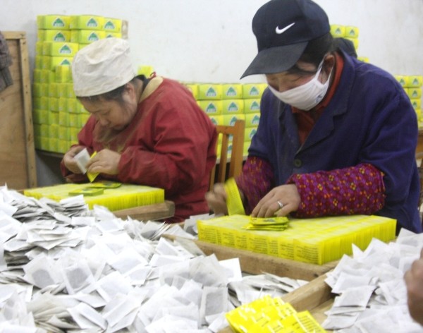 三月二十四日,随州康汇公司员工正在进行包装袋包茶作业。该公司是曾都区招商引资、集农产品(银杏、葛根、茶叶、香菇)开发、生产、加工、营销于一体的现代化综合企业。(本报记者周强、杨闻名摄)