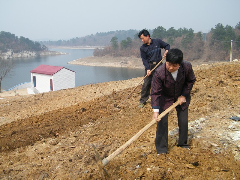 三月中下旬,随县封江生态旅游区湖北倍思蓝莓研究中心种植示范基地,十余名农友正挥镐翻耕,施农家肥,整垄切沟,移苗植苗,一派繁忙。(龚承斌 胡晓霞 摄)