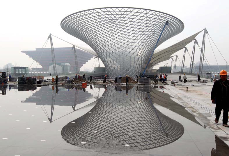 3月31日,工人正在世博轴前的庆典广场施工。4月1日,上海世博会将迎来开幕倒计时30天,目前,世博园区内各项建设已进入尾声,近万名工人正加班加点,确保4月下旬世博园区如期投入试运营。上海世博会将于4月20日启动试运行,预计园区内七成展馆将参与。31日,位于上海世博会浦东园区的世博文化中心正式竣工。至此,上海世博会的中国馆、主题馆、世博中心、文化中心、世博轴等五座新建永久性建筑全部建成。 (新华社发)