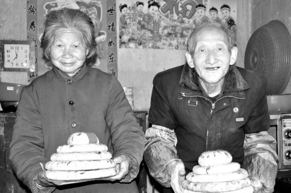 随县安居镇安居居委会8组75岁的魏绍明(右)与妻子石光华,以传统的技艺制作面点套饼香、酥、脆,远近闻名。他们从18岁开始制作套饼。如今,三乡五里凡是有过生日、做寿的、办喜事的,都要提前到他家定做。魏家的套饼生意仍然十分红火。 (本报记者 陈德友摄)