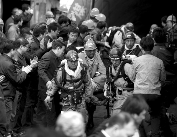图为:4月5日,救援人员将获救矿工抬出井口。