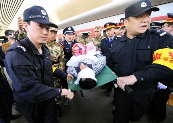 图为:王家岭煤矿事故60名获救工人抵达太原接受治疗