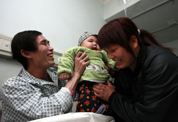 4月9日,在太原山西医科大学附属第二医院,王家岭矿难河南籍获救矿工朱自晓(左)与妻儿见面。朱自晓高兴地举起只有五个月大的儿子,掂了掂,大声说:“哈哈,我的儿子又胖啦!”当日,山西医科大学附属第二医院组织第二批家属看望在此接受治疗的王家岭矿难获救矿工。(新华社发)