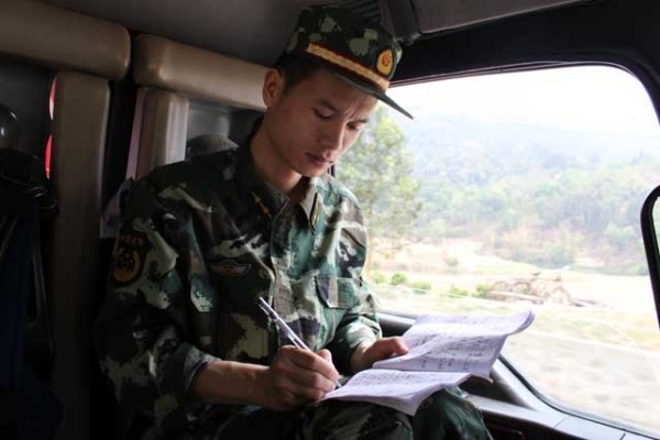 4月9日,卢世伟在车上写日记。卢世伟——广西柳州消防抗旱突击队队员,一个普通的消防战士,如同他的战友一样,正冲锋在抗旱救灾的第一线。持续的旱灾让广西东兰县各乡镇学校师生用水不断告急,卢世伟3月31日的一篇送水日记,展示着在特大旱灾面前,这些可爱的人,用无言大爱,泽润着干旱的南疆大地。 (新华社发)