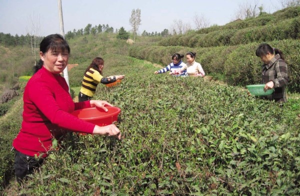 随县柳林镇院子河村依托本地山场资源,大力发展养鸡、养牛、茶叶生产,使不少农户走上致富之路。图为村民正在茶场采摘春茶。 (杨俊 立健摄)