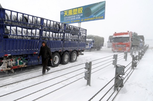 4月13日,一名司机从滞留在哈同公路金家收费站附近的车辆旁走过。受暴雪影响,4月13日7时30分左右,黑龙江省境内5条高速公路已全线关闭。13日早晨,黑龙江省部分地区的暴雪仍在持续,黑龙江省气象台和哈尔滨市气象台分别发布部分地区暴雪红色预警信号。 (新华社发)