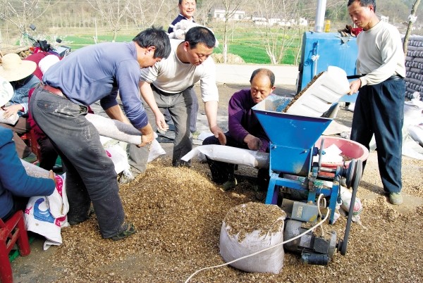 曾都区洛阳镇九口堰村农民连日来正进行袋料香菇加工生产。村民们介绍,他们现在每天能加工4000余袋,这些袋料香菇准备销往武汉,每袋卖到10元左右,村民每月能挣工钱900至1800元。(本报记者 孙洪涛 特约记者 刘金伟 摄)