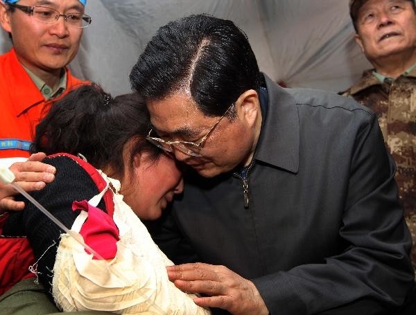 图为:胡锦涛在玉树州体育场医疗救助点慰问受伤的藏族学生