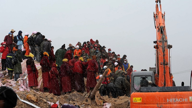 4月20日,在玉树县结古镇扎西大同村,救援人员冒雪搜救。当日,青海玉树地震灾区出现雨雪、冰雹以及大风沙尘天气,给抗震救灾工作带来不利影响。