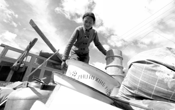 4月19日,15岁的藏族女孩索南求藏从废墟中挖出残存的物品。 (新华社发)