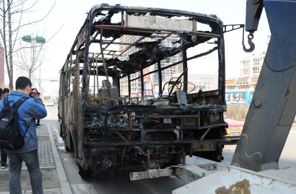 4月23日,公交车残骸被拖离事故现场。当日9时左右,长春市一辆公交车在行至吉林大路与民丰大街交汇处时突然起火,经过消防人员救援后大火被扑灭。起火后,车上的20多名乘客和司乘人员全部及时下车,没有人员伤亡。目前,事故原因正在进一步调查中。(新华社发)