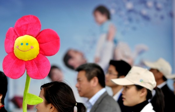 4月23日,一队参观者在手持绒花的领队带领下在上海世博会浦西园区参观。当日,世博园区迎来第三场试运营,园区的各项设施和服务将接受10万人次观众的考验。 (新华社发)