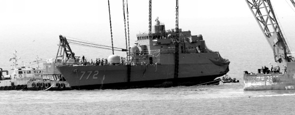 4月24日,在韩国白翎岛附近水域,工作人员在打捞“天安”号警戒舰舰首。韩国军方打捞人员当日将上月沉没的“天安”号警戒舰舰首残骸打捞出水,同时找到一具遇难者遗体。一些军方官员说,以船首部分裂口形状为依据分析,外部冲击导致军舰沉没。
