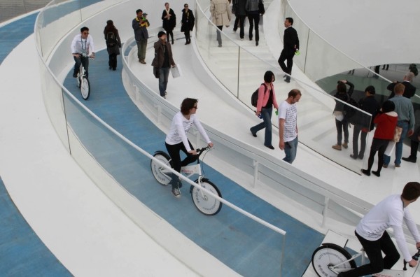 4月25日,来宾在丹麦馆享受骑行的快乐。当日,上海世博会丹麦馆正式开馆迎客。结合螺旋形的建筑外观,丹麦馆别出心裁设计了一条300米长的自行车通道,同时准备了自行车供观众免费骑乘,享受骑行的快乐。上海世博会25日迎来第五场试运行,游客人数从24日的30万增加到35万,虽然低于此前既定的50万人,但是这场试运行仍然是到目前为止,观众人数最多的一次“大客流”测试。 (新华社发)