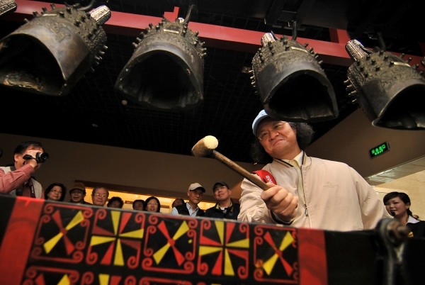 敲响千年编钟,感受中华文化,台北市新闻记者公会理事长袁天明敲响编钟,体验编钟美妙动听的旋律(右图)。