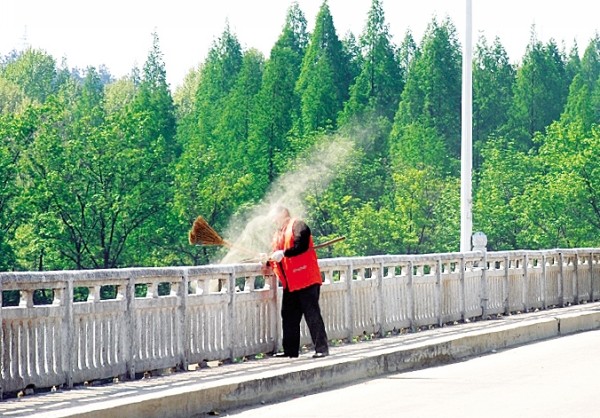 图二:涢水桥上,一名身穿环卫工作服的工人将清扫的垃圾直接抛向河中。(本报记者 木子 通讯员 深蓝摄)
