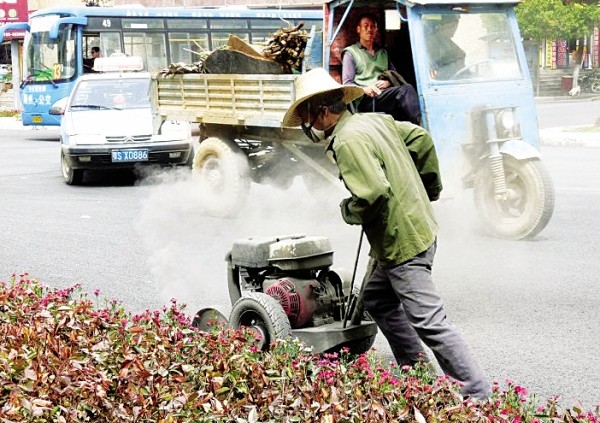 图一:随城汉东路、舜井大道马路刷黑工程实施中,工人用机械切割路面时扬起一人多高灰尘。