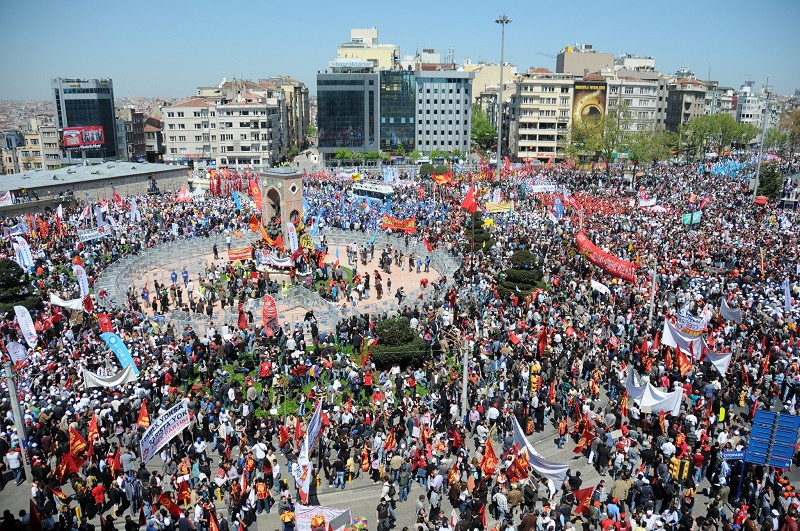 5月1日,成千上万土耳其民众聚集在伊斯坦布尔塔克西姆广场,庆祝“五一”国际劳动节的到来,同时呼吁政府解决失业者的就业问题。 (新华社发)