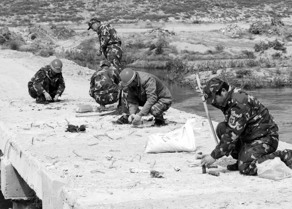 曾都区防汛抗旱指挥部日前组织有关部门人员,依法对在府河上游、氵厥水河道内非法采沙的违章建筑物进行强行拆除。