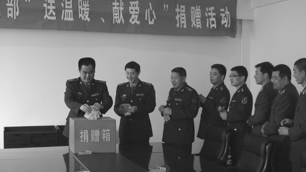 为表达对青海玉树地震灾区人民一片爱心,近日,曾都区人武部官兵职工开展了向灾区人民捐款献爱心活动,共捐赠4200元。图为捐赠情景。 (本报记者 唐天才 通讯员 裴作明摄)
