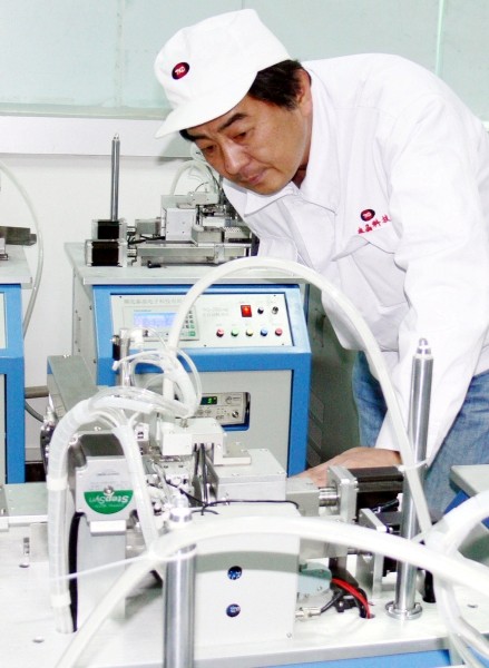 泰晶电子公司去年高薪聘请日本专家鹤田行德先生担任总工程师。鹤田先生带领科研人员积极从事石英音叉晶体生产设备的研发,对现有生产工艺进行改进和创新。目前,该公司已拥有专利21项,科技成果2项,公司参与制定国家标准2项。(本报记者 孙洪涛 特约记者 刘金伟摄)