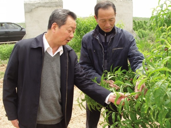 近日,市老促会会长吴治炎(左一)来到随县吴山镇山丰村村民杜友义的油桃基地,现场指导他加强果树管理。前段时间因气温低给油桃生长带来不利影响,吴治炎指导他要做好防治病虫害工作,以增产增收。 (石守京 温沪摄)