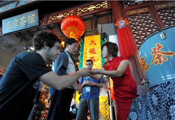 5月4日,位于上海世博园宝钢大舞台内的“北京茶馆”开门迎客。据介绍,面积约300平方米的“北京茶馆”是北京市旅游局根据老舍茶馆的元素设计而成,茶馆内的所有陈设均是从北京的老舍茶馆搬来。 (新华社发)