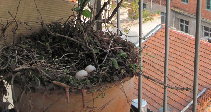 今年4月,在随州日报社大院杨女士家的阳台上,一只斑鸠飞来筑巢安家,并孵出两只小鸟。