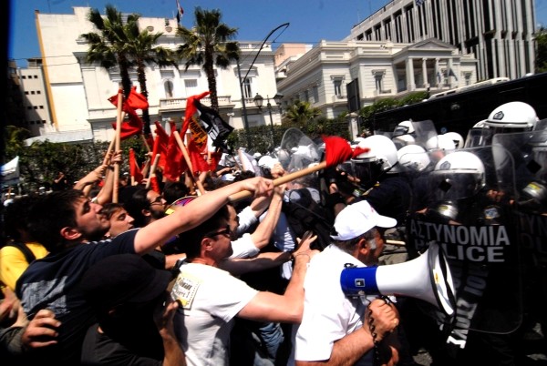 5月4日,数百名希腊民众在雅典市中心举行示威游行。希腊政府2日公布与欧盟和国际货币基金组织商定的救助方案细节后,希腊民众重新开始新一轮示威活动,抗议严厉的紧缩政策。 (新华社发)