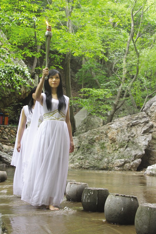 图②圣女们带着圣火,踩着山间清泉,沿着长满野花的小径前行。