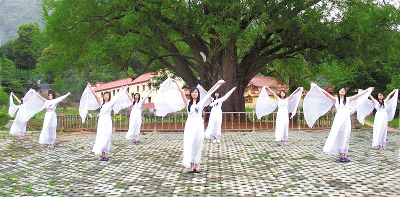 图③九位圣女张开双臂,在古银杏树下仰望苍穹,虔诚地为先祖祈福。