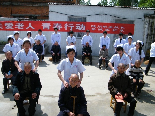 5月9日,随州职业技术学院09级医护系的50余名学生来到随县光荣院,为生活在这里的孤老等表演了精彩的文艺节目,进行健康体检、按摩推拿等感恩社会活动,以此纪念5·12国际护士节,受到老人们的赞誉。 (龚承斌 梅富摄)