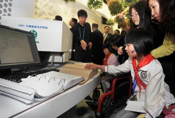 5月10日,汶川地震致残儿童在生命阳光馆内感受盲文打印机。当日,上海世博会生命阳光馆在世博园区市民广场举行活动周启动仪式。 (新华社发)