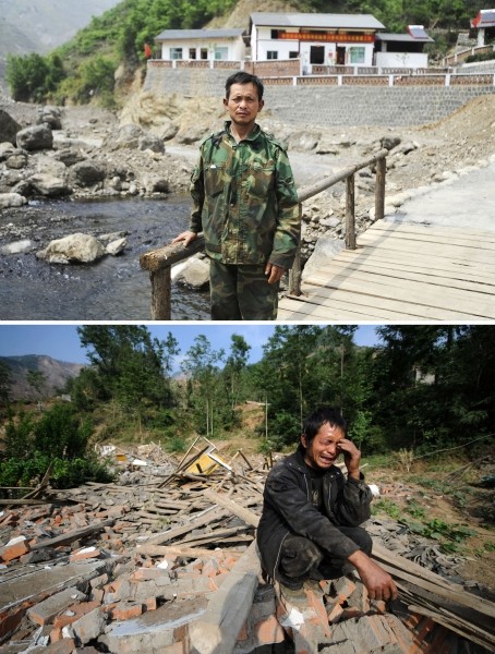 2008年5月15日,从外地赶回家的何清跃在自家房屋的废墟上痛哭。