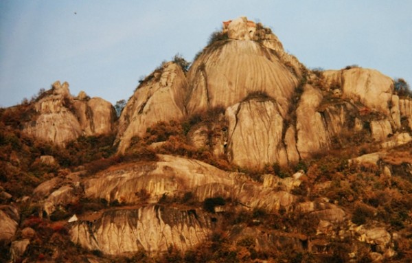 听着动人的故事,欣赏着大自然的杰作,我们竟忘记了一路的疲劳。山路上铺着一层厚厚的黄叶,踩上去软软的,让人觉得仿佛走在一条通向天宫的路上。整座鸡鸣山就是一块巨大的淡黄色的石头,像一只站在空中报晓的雄鸡,威武雄壮。偶尔会有一些生命力顽强的树木,为这座险峻的山峰添上俊秀的一笔。