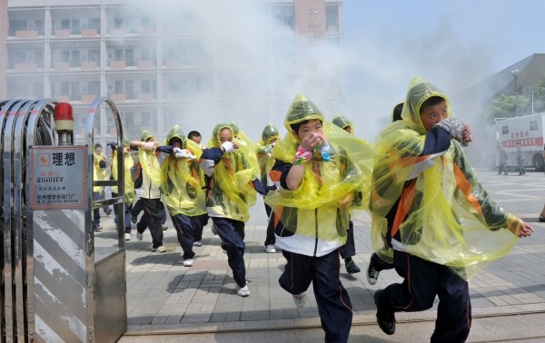 5月12日,杭州市第十五中学参加演习的学生听到防空警报后,有秩序地奔向附近的地下防空设施。当日是我国第二个“防灾减灾日”,各地举行各种防灾减灾演练,增强人民群众的防灾减灾意识和应急自救能力。 (新华社发)