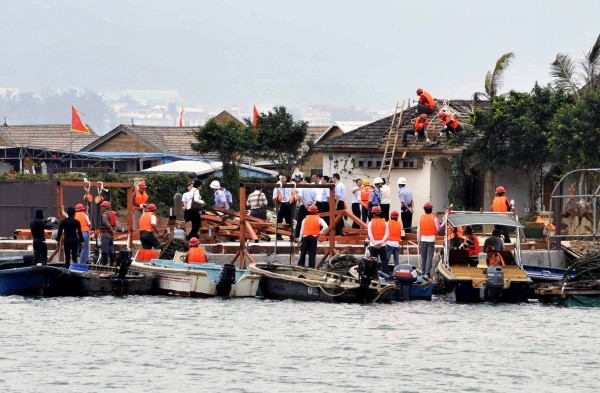 5月13日,工作人员开始拆除“海上皇宫”。深圳“海上皇宫”漂浮在离市区50多公里的南澳东山湾海域上,据称建设耗资近亿元,是一座不对外营业的豪华私人会所。2003年兴建,2005年被政府相关部门认定为违法建筑,但一直屹立不倒,照常运转。经过媒体报道后,“海上皇宫”事件引发广泛关注。 (新华社发)