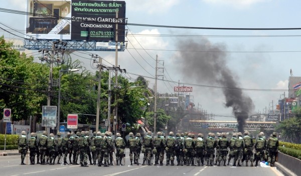 据报道,当地时间12时10分左右,约300名泰国军人向在曼谷隆披尼夜市附近设立检查站的“红衫军”发射催泪瓦斯,试图驱散示威者。示威者则用石块、弹弓和燃烧瓶还击。一些人点燃了轮胎和一辆停靠在路边的警车。冲突持续了约40分钟。在拉差巴洛路口的冲突中,双方还发生了枪战。在其他地点,军队使用了橡皮子弹和催泪弹。