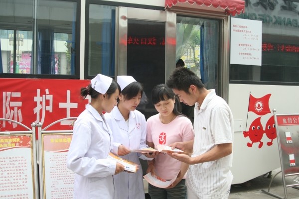 5月12日,随州职院护理专业学生来到解放路无偿献血车前,向过往市民宣传无偿献血知识。 (徐军国摄 徐勇斌 肖新俊文)