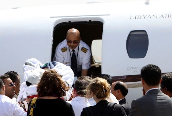 5月15日,在利比亚首都的黎波里,利比亚空难中的唯一幸存者、9岁荷兰男孩鲁本被抬上一架救护飞机。当天,鲁本在家人的陪伴下离开的黎波里,踏上回国的旅程。 (新华社发)