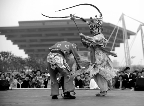 随着上海世博会渐入佳境,世博客流屡创新高。14日入园客流超24万人次,创开园以来最高纪录;15日,截至17时已突破30万人次,再创新高。图为5月15日,在上海世博园庆典广场,演员在表演河北梆子《扈家庄》。世博园庆典广场每天都安排了两场舞台表演。新华社发