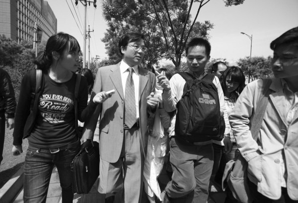 图为:5月18日,宣判后,媒体采访黄光裕律师杨照东。