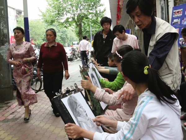 在生活中观察,在生活中学习。图为随州福安画廊的教师们,利用双休时间,带领学生在街头练习画画。(本报记者 张顺 摄)