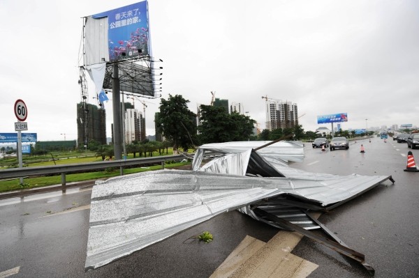 5月19日,广西柳州市阳和工业新区一大型户外广告牌被大风吹掉一角。当日凌晨4时许,广西柳州市市区遭遇瞬时7级大风,造成多处房屋屋顶被掀翻。(新华社发)