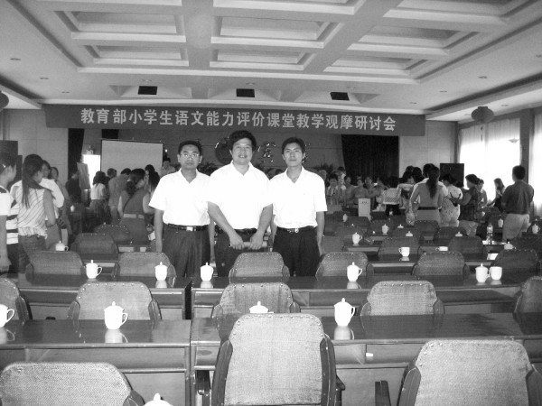 草店镇中心小学校长禹宗保(中)带领教师参加“教育部小学生语文能力评价课堂教学观摩研讨会”。