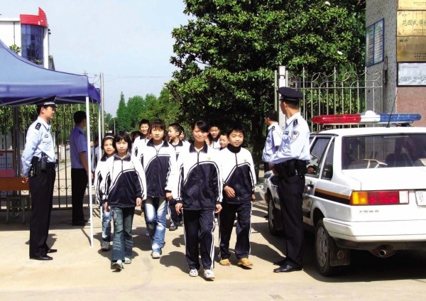 5月19日,随县“警校共建”活动在尚市镇正式启动。当地公安机关向中小学校选派驻校民警,协助学校开展法制教育,维护校园及周边治安秩序,保障师生人身及财产安全。图为尚市派出所干警带领尚市二中安保人员在学校门口值勤。(刘先付 摄)