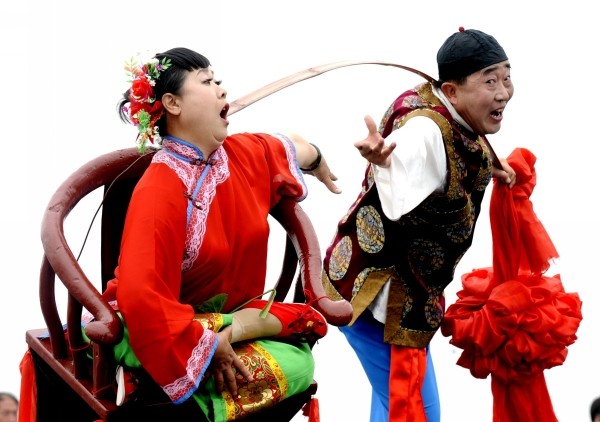 五月二十日,山西省孝义市的两位民间演员在世博园庆典广场表演秧歌《回娘家》。两位演员极具地方特色的精彩表演赢得了观众的喝彩。(新华社发)