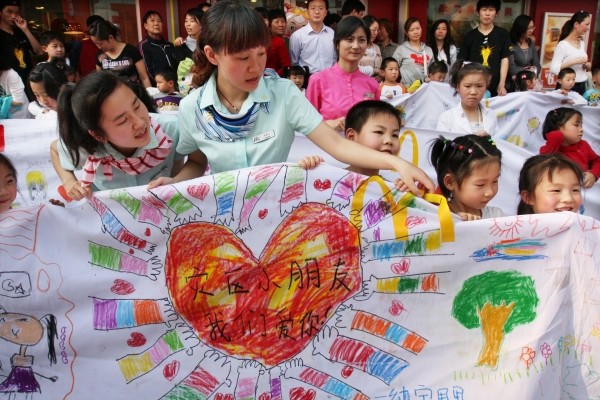 5月23日,由新世纪购物中心、麦当劳随州店等单位联合举办的“众志成城,心系玉树”百名儿童百米画展公益活动在购物中心门前举行。绘画作品通过随州市红十字会寄往玉树,以传递希望和爱心。(本报记者 杨闻名摄)