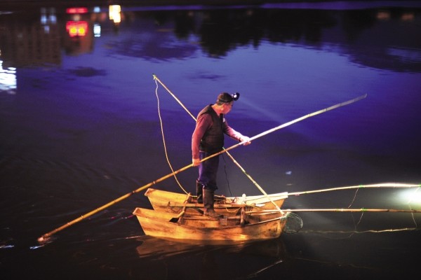 市民反映,白云湖夜晚电打鱼现象严重。5月22日晚,记者沿白云湖采访,摄下了一位戴着头灯驾舟在一桥旁边用电打鱼的渔民。记者数了一下,当晚白云湖至少有4只电打鱼的小舟。 (本报记者 李文军摄)
