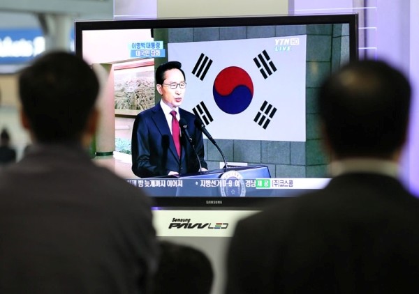 图为:市民通过电视观看韩国总统李明博讲话